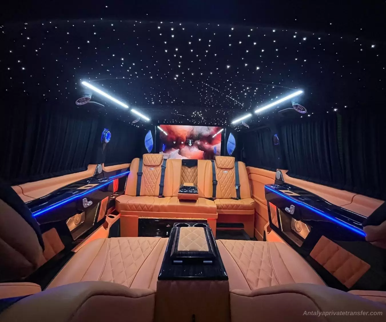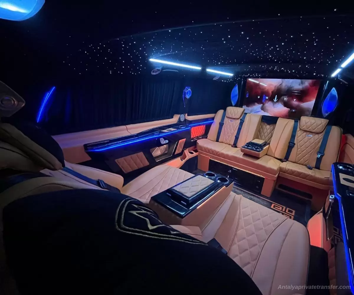 Unser Vito-Van mit seinem Ultra-VIP-Design wird Ihr Anblick sein. Mercedes Vito ist darauf ausgelegt, den Reisenden eine VIP-Behandlung zu bieten. Das Unterhaltungssystem im Auto und der kostenlose WLAN-Service sorgen für den frischen Anfang Ihres Urlaubs. Der Zugang für Rollstuhlfahrer und Kinderwagen ist ebenfalls möglich. Unser Vito-Van kann bis zu vier Personen transportieren. Genug zum Plaudern, wenig genug, um den Komfort nicht zu beeinträchtigen. Dies ist die luxuriöseste Art des privaten Transferservices in Antalya